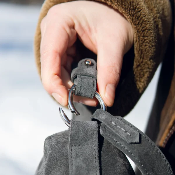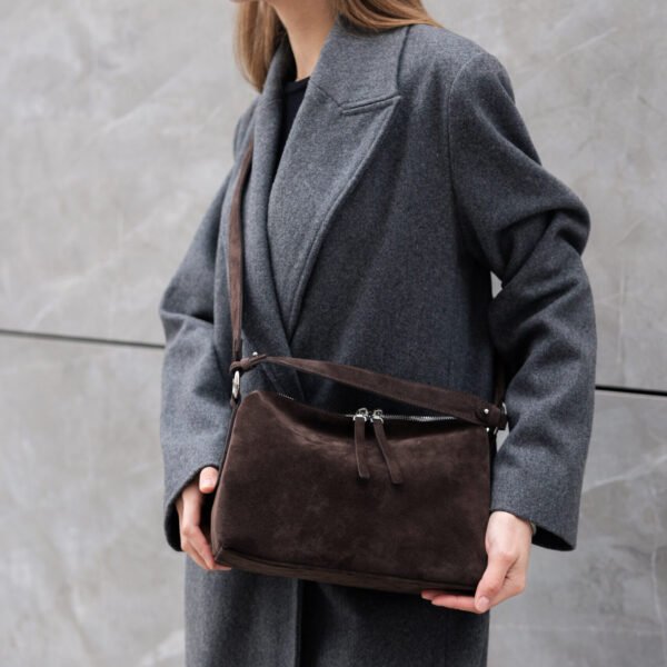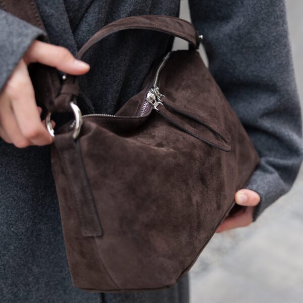 Сумочка із шоколадної замші моя улюблена, дуже приємна на дотик, стильно виглядає, всередині є тримач для ключів та маленький брелок, що дуже зручно. Якісна фурнітура.